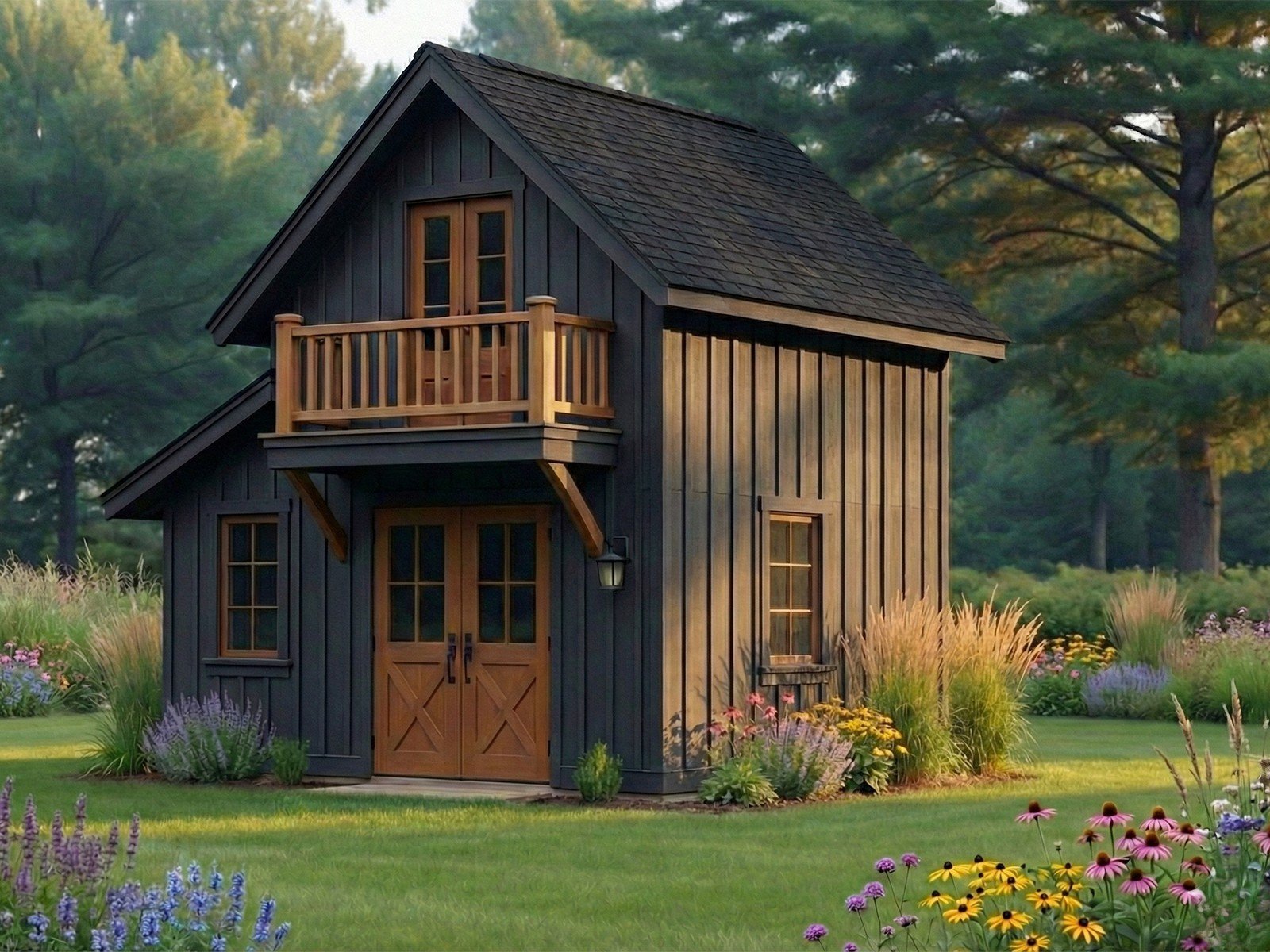 The Pine Ridge Bunkie is a compact, Appalachian-inspired backyard retreat finished in warm Appalachian Brown board-and-batten siding. A signature second-floor balcony creates visual charm while also protecting the front entry below. Tall, vertically proportioned windows fill the interior with natural light and give the structure a graceful, well-balanced appearance. Ideal as a backyard office, creative studio, or guest bunkie, the Pine Ridge combines heirloom-inspired craftsmanship with smart, space-efficient design for homeowners who want beauty, function, and lasting character in one small footprint.
